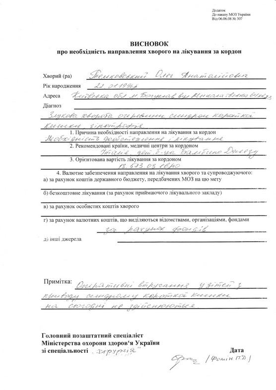 Медицинские заключения специалистов МОЗ Украины о необходимости дообследования и лечения за границей.